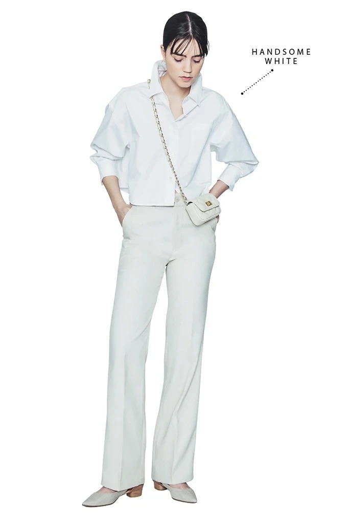 コンパクトな白シャツとつなげるイメージで、ハイウエストパンツを抜擢。ショート丈ならスタイルUPしつつ、シルエットに差もつき、ワントーンでも間延びしないという利点も。