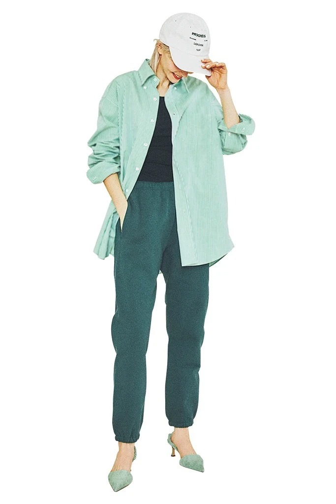 シャツとスエットでグリーンの濃淡をつけたワザあり配色コーディネート。白キャップはそんな隙のないグリーン一辺倒のカジュアルスタイルにリズムを生む、スペシャルな合わせ。