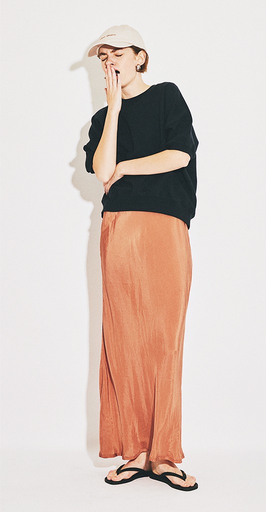 ネイビー半そでスエット 13,200円/MICA & DEAL(MICA & DEAL 恵比寿店) スカート 31,900円/ザ ビューティフル(ロンハーマン) キャップ 7,700円/ステータス アングザエティー(ジャック・オブ・オール・トレーズ プレスルーム) ピアス 22,000円/フォークバイエヌ(UTS PR) サンダル 2,750円/イパネマ(シードコーポレーション)