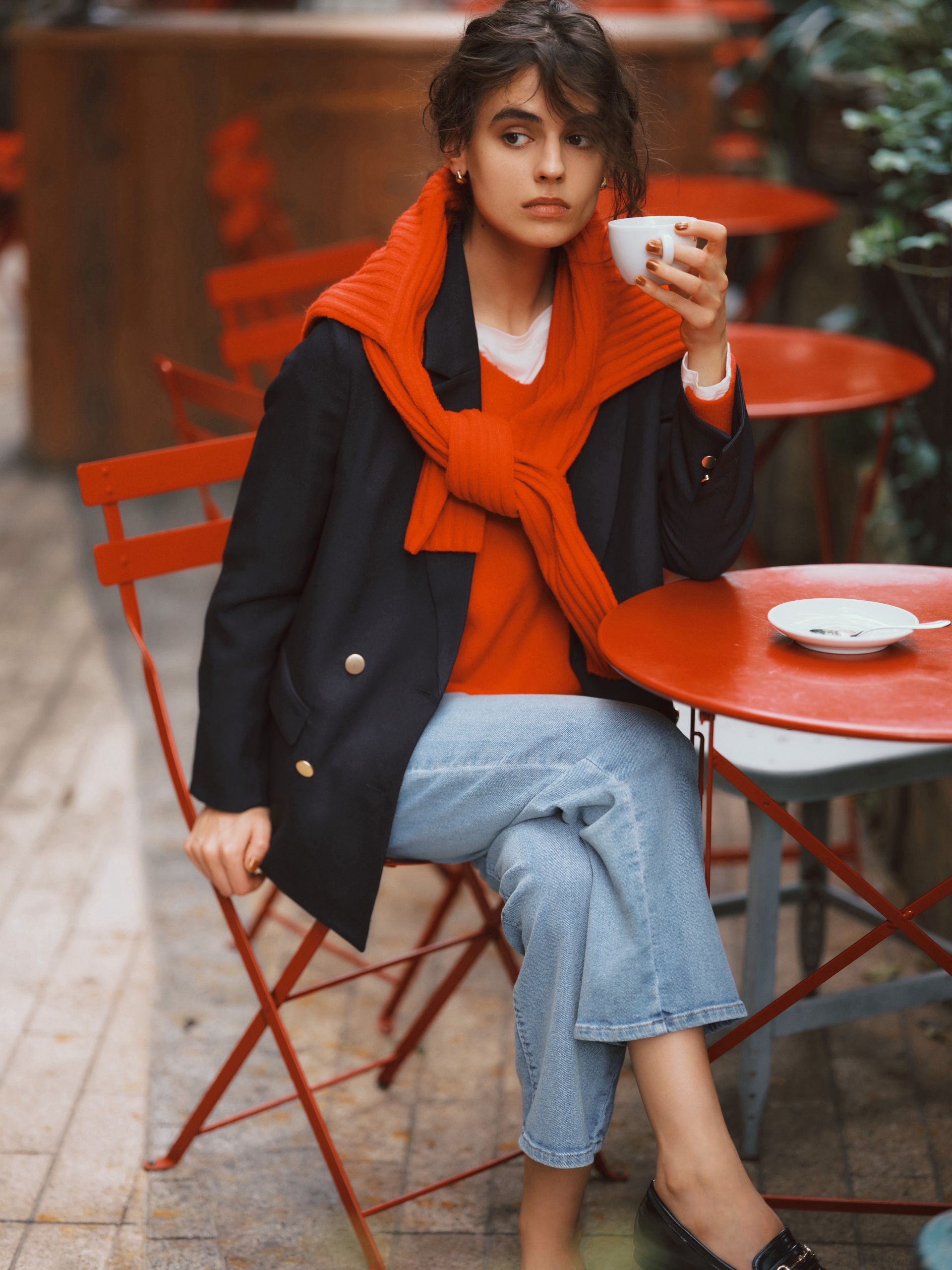 GISELe(ジゼル) (横スワイプで次の写真へ) 5 / 9 惹かれる色は紺ブレと一緒に品よく効かせる ネイビーウールライクジャケット 8,998円、肩にかけた赤ハイネックニット 4,499円、赤Vネックニット 4,499円、中に着た白ロンT 3,498円、ブルーデニムパンツ 6,589円、ローファー 5,995円/以上ロペピクニック シルバーピアス/スタイリスト私物 ➡スワイプして次のコーディネートを見る この記事の詳細を見る