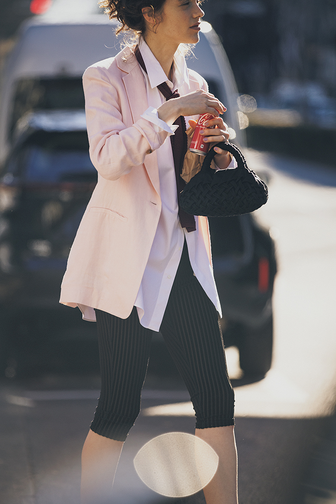 レギンスのストイックさを中和する穏やかなピンク