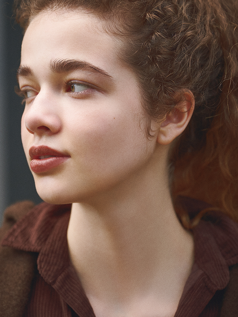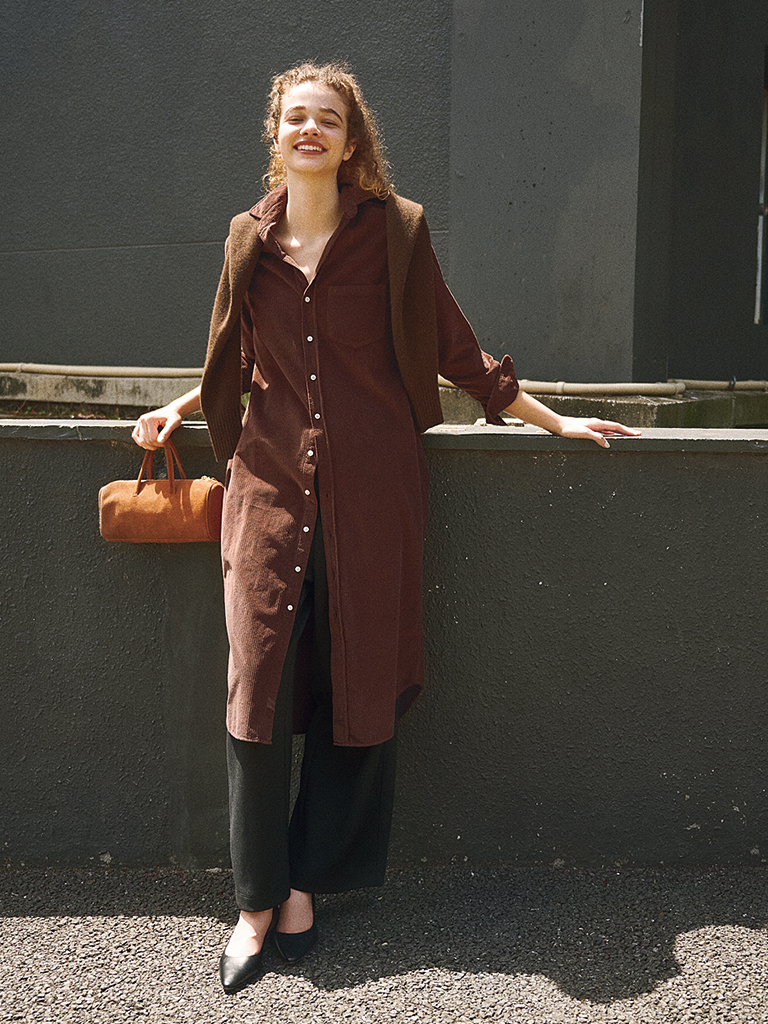 ひざから下はシャープに徹して、ブラウンのコーデュロイシャツをほっこり見せずにメリハリよく。切れ味のいい黒を仕込みつつ、メインはバッグやリップまで及ぶブラウン系で穏やかに統一。