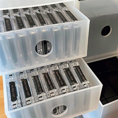 「無印良品のポリプロピレンボックスにアディクションのアイシャドウを収納。とくにこの6段タイプがぴったり。アイシャドウ背面のシールを脇にはり直すと色名がラベリングできオススメ」(内山奈穂さん・アディクションPR)
