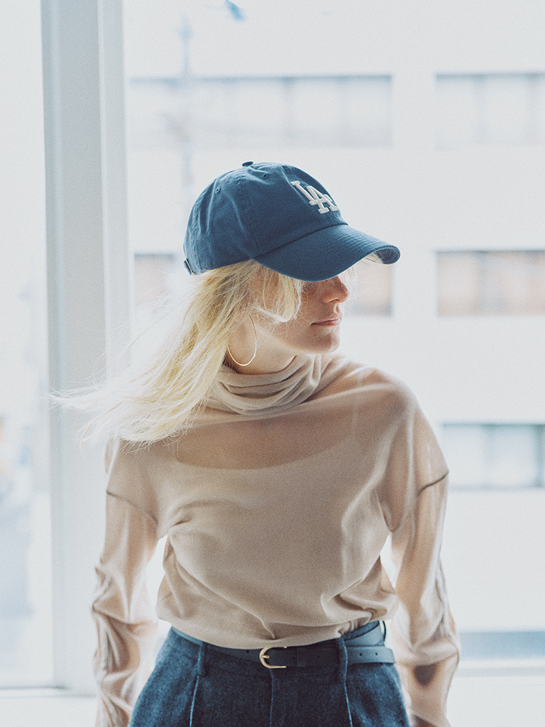 腰まわりはコンパクトながら脚線を拾わない絶妙なゆるさ黒デニムは、双子のセシリーとともにジュエリーブランドを立ち上げ、モデルとしても活躍するアマリーとアッパーハイツとのコラボアイテム。上質で心地よい素材による余白で、硬派な黒を女性らしく転換。タックIN+ベルトで引き締めてすっきりと。