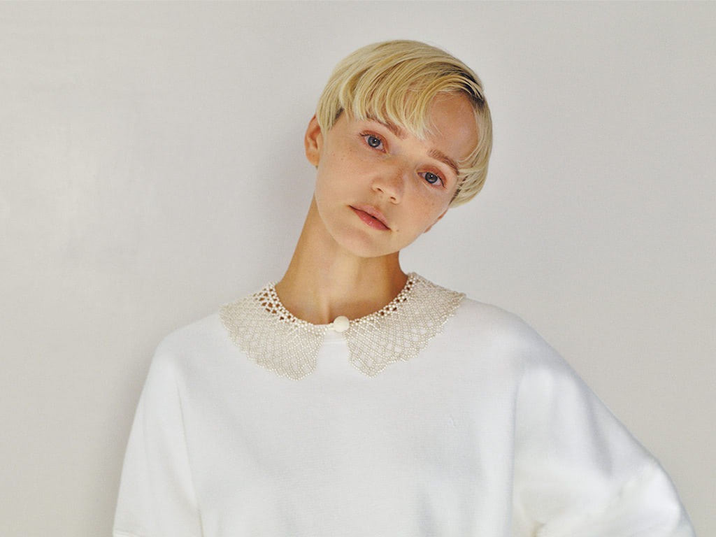 色を合わせてスウェットをドレスアップ。白スウェットとトーンをそろえてバランスよく。繊細に形成された贅沢なつけえりは、ニットやウールなど、冬素材のトップスにこそ映えるみずみずしさ。