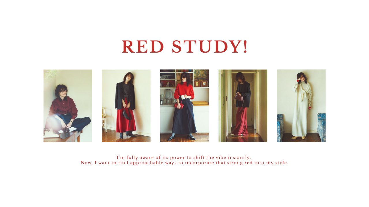 1つ入るだけで空気を変えるポテンシャルの高さはわかっているから。知りたいのはそんな強さのある赤ともっとフランクにつきあえるバリエーション。色みやアイテムに広がりを見せる今こそ試したい「強いだけじゃない」スタイリングの可能性を模索。
