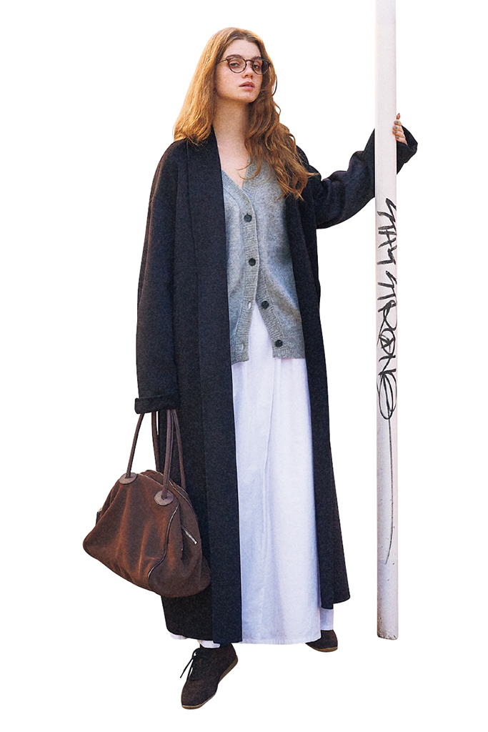 あたたかさを求めたい今の時季に、あえて配色だけはぬくもりをセーブ。明るいトーンでまとめれば黒と差がつき、リラックス感のある上下にメリハリまで獲得。コートだけが浮かないよう、小物はブラウンを選んで重みを分散。