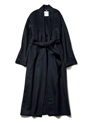 黒コート(ベルトつき)/ルル・ウィルビー(アルアバイル) 簡単に縦長フォルムがつくれて、上品かつどんなインナーともバランスがとりやすいロング丈。前開きのガウンタイプだと、かっちりしすぎず長い黒にも抜け感が。贅沢なカシミヤ混。