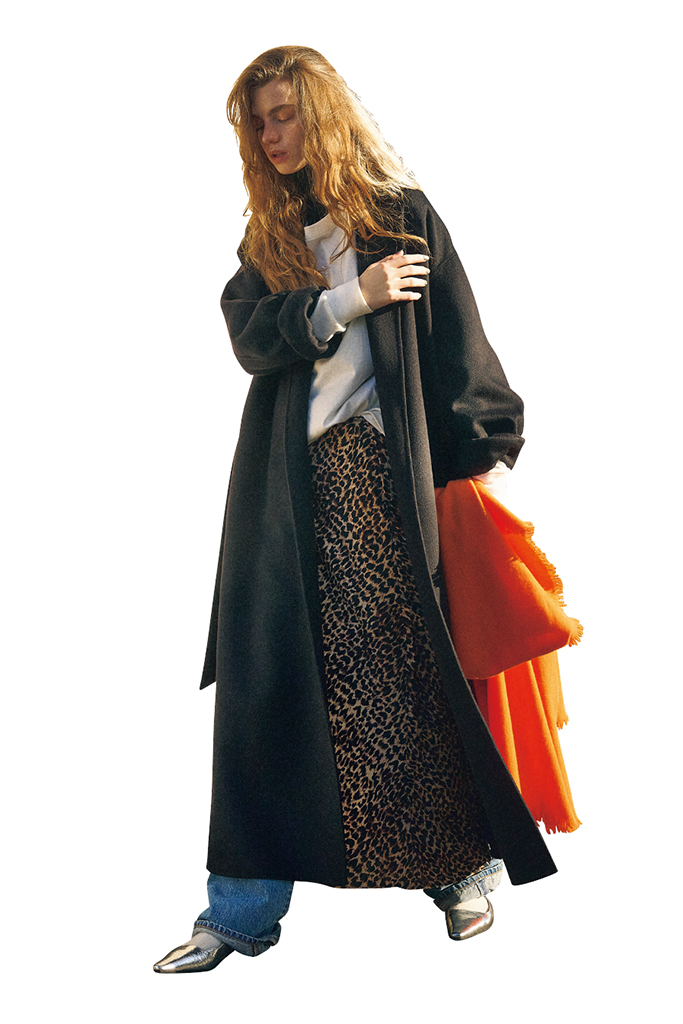コートの中より、見えている足元に注力。たとえば1枚で成り立つ柄スカートにデニムをIN。アクセントとしてシルバーのシューズも投入。高度なボトムレイヤードも、古着っぽいデニムのあせた風合いで親しみが残る。