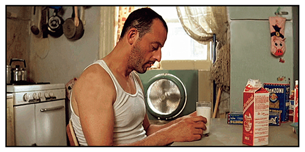 孤独な殺し屋レオンと12歳の少女マチルダの絆が描かれる。レオンがコップに注がれたミルクを見つめるキッチンのシーンでは、あせたグリーンをはじめとした淡いトーンでまとめられたキッチンに、鮮やかな赤のミルクパッケージが抑揚をつけるアクセントに。