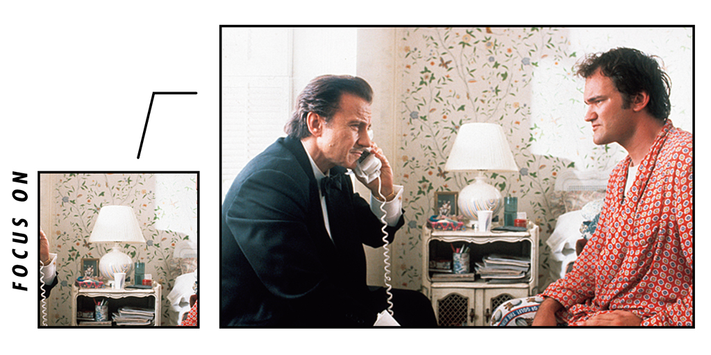 1990年代のアメリカポップカルチャーを代表するダーク・コメディ。小花柄の壁紙や品のいい白の間接照明が印象的なガーリーな部屋は、緊張感あふれる犯罪シーンとのコントラストがきわ立つ。中央のチェストには紙コップや雑誌が乱雑に置かれ、ベッドでも読書を楽しんでいるようすがうかがえる。