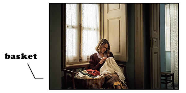 舞台は1938年のイタリア。縫い物をする主人公ジーニアのそばには、大きなラタンのかごが。衣類を畳む前の目隠しにも好都合で、丁寧にいれない無造作感が無機質な部屋にニュアンスを生む。洗濯が済んだらここに入れる、ここにたまっているものを畳んで仕分ける、という分かりやすさもポイント。