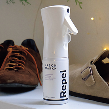 「JASON MARKKのPFASフリーリペルは、スプレーするだけで、水分と汚れを寄せつけないバリアを形成。水性製品だから、スエードやキャンバス地など生地を問わず使用できます。」(金田さん)