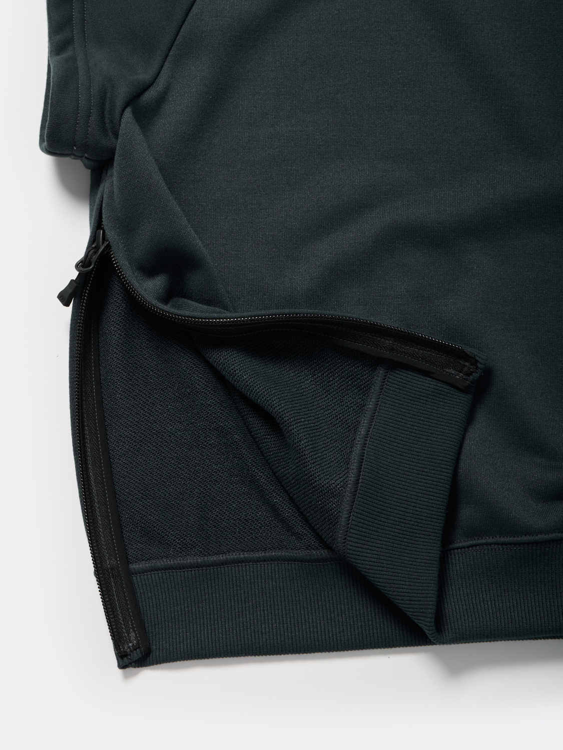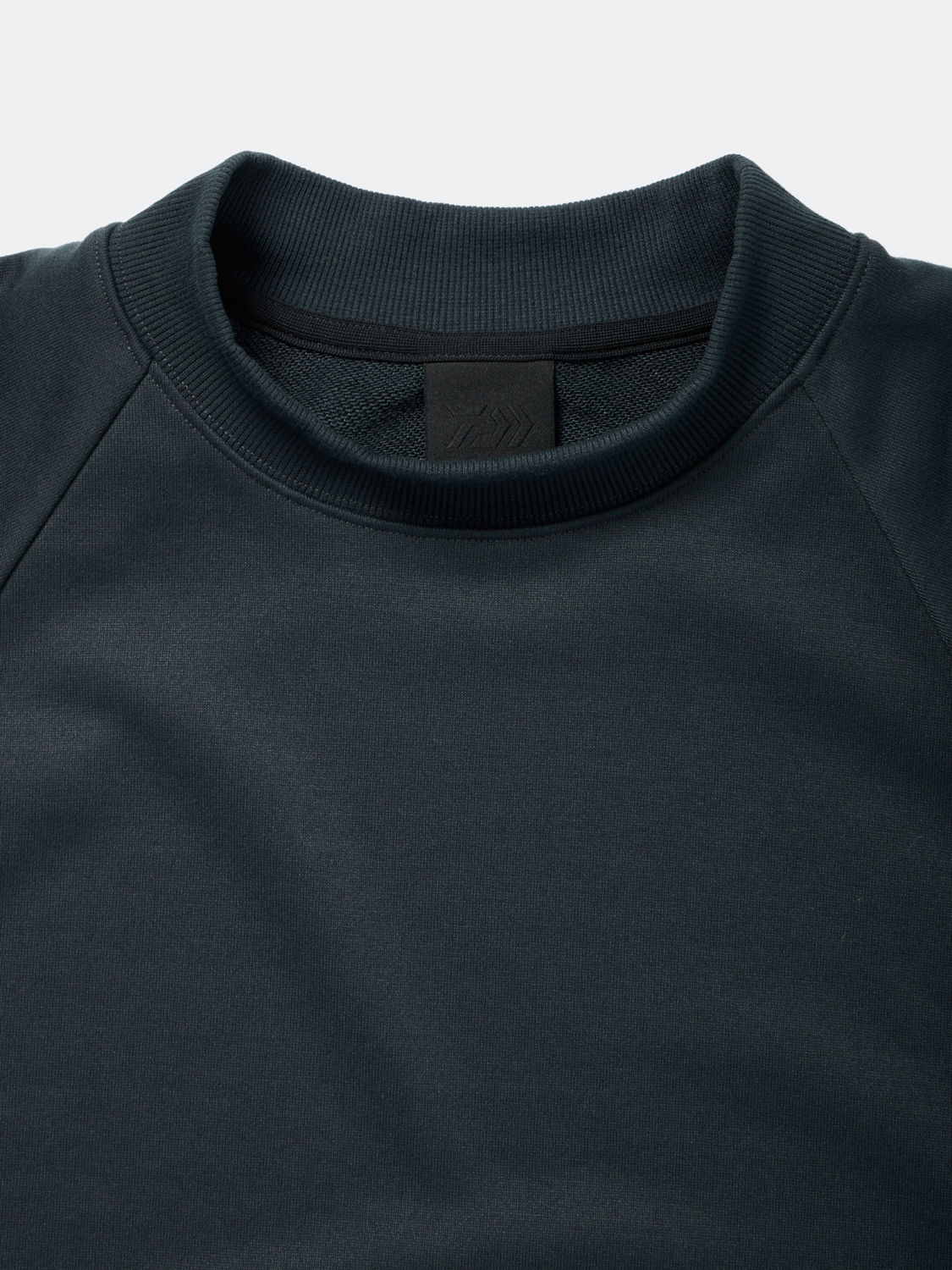 ポリエステルスパン糸を使用し、コットンのようなタッチを実現したヘビーウェイト裏毛のスウェット。コットンとは異なり、ポリエステル組成のため軽量で、色落ちなどの経年変化がしにくい点が特徴。