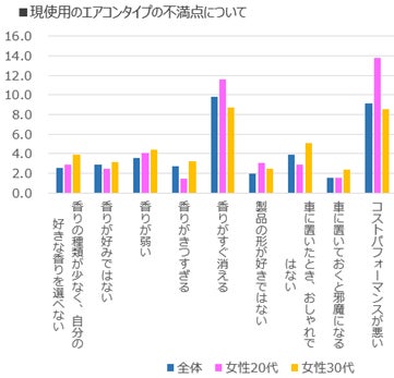 女性運転者を対象に「現在使用しているエアコンタイプ(車内のエアコン送風口に取り付けるアイテム)の不満点」についての実態調査(※1)をしたところ、“香りがすぐに消える”“コストパフォーマンスが悪い”“おしゃれではない”といった、香りやデザインに対する不満点が多く挙げられました。