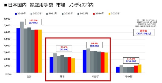 繰り返し使用できる“ノンディスポタイプ”の家庭用手袋市場において、“うす手”や“中厚手”の推計販売規模は、近年横ばいが続いています。