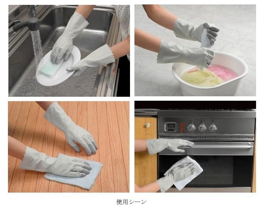 カラーは、暮らしになじみ、汚れが目立ちにくい薄いグレーをベースにしており、サイズはS、M、Lの3種類。食器洗いやお掃除、お洗濯など、暮らしの様々なシーンで活用できます。