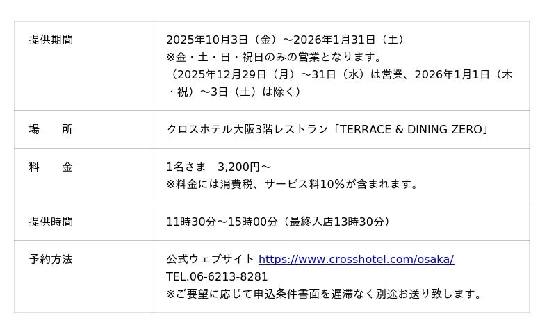 クロスホテル大阪(所在地:大阪市中央区、総支配人:水谷 之則)のレストラン「TERRACE & DINING ZERO」では、好評をいただいている“時間無制限”のランチビュッフェに、2025年10月3日(金)~2026年1月31日(土)の期間限定で新メニューが登場します。
