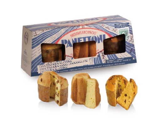 3ケ入り(280G)ビンテージ スタイルのケースに詰めたミニチュアのセレクション。 中には、砂糖漬けのフルーツとレーズンが入ったクラシック パネットーネ、クラシック パンドーロ、チョコレートチップが入ったパネットーネが入っています。