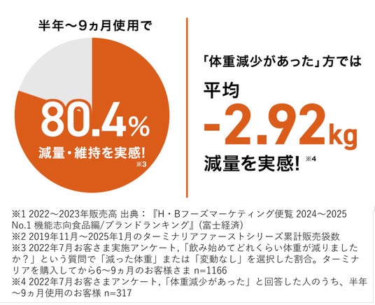 – 顧客アンケート結果:80.4%が減量・維持を実感(※3)、平均体重変化量:-2.92kg(※4)