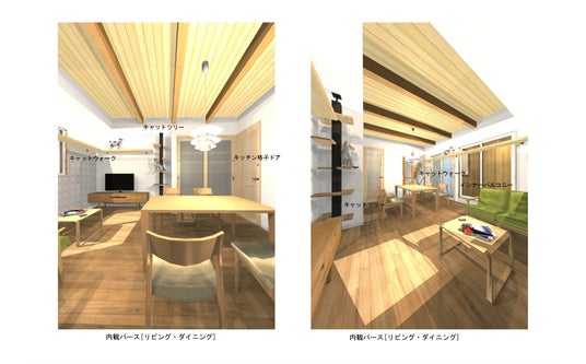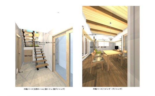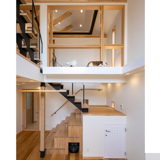 建築コストを抑える木造でありながら、上下階を1住戸とする構成で、生活音トラブルや上下階干渉を軽減します。内装もデザイン性を高めながら猫のための仕組みが組み込まれています。