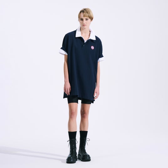 オーバーサイズのシルエットにポロシャツを重ねたレイヤードスタイルが、よりスタイリッシュな雰囲気を演出します。