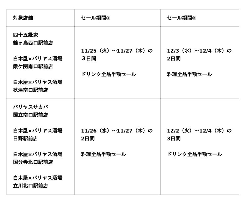白木屋×バリヤス酒場 国分寺北口駅前店セール実施日