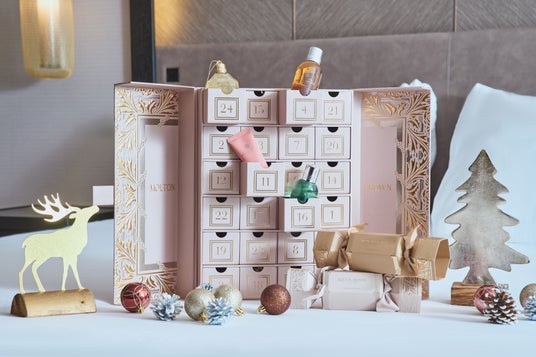 プラン1.【Premier Christmas Stay with Molton Brown】 ピンクにゴールドをあしらった煌めく額縁をモチーフにしたボックスの中には、モルトンブラウンの人気ボディケアやフレグランス全24品を豪華に詰め合わせました。年に一度、この時期限定の「Advent Calendar」が付いたプランです。