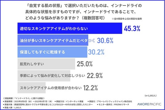 インナードライの肌状態への悩みとしては、約半数が「適切なスキンケアアイテムがわからない」と回答し、インナードライ肌のケアの難しさがうかがえます。