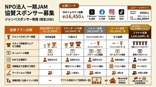 現在、一期JAMのSNSフォロワーは総数約16,000人、公式ホームページの月間ページビューは約2,000PVとなっており、地域活動の様子やイベントの情報を広く発信しています。企業パートナーには、SNSやホームページでの紹介、イベントでの企業ロゴ掲示など、社会貢献活動の発信につながる特典が用意されています。