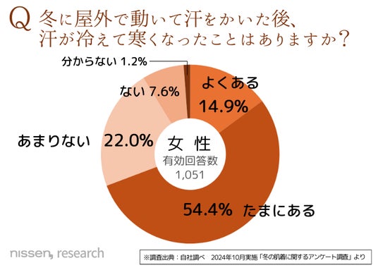 さらに2024年に実施した「機能性肌着」に関するアンケートでは、女性の約7割が「冬に暖房のきいた室内で汗をかく」「汗が冷えて寒くなる」経験があると回答。