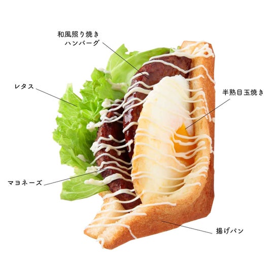 サクッと揚げたパンに、和風てりやきハンバーグを丸ごと一枚、半熟卵を豪快に挟み込んだ『月見てりやき』。