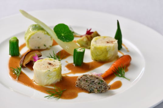 沖縄の健康長寿を支えてきた島野菜や豆腐料理に着目し、フレンチの技法を用いて、テラスならではのウェルネスキュイジーヌに仕立てました。ソースには昆布や椎茸を使用、植物由来の素材だけで滋味豊かに仕上げた消化にもやさしい一品です。