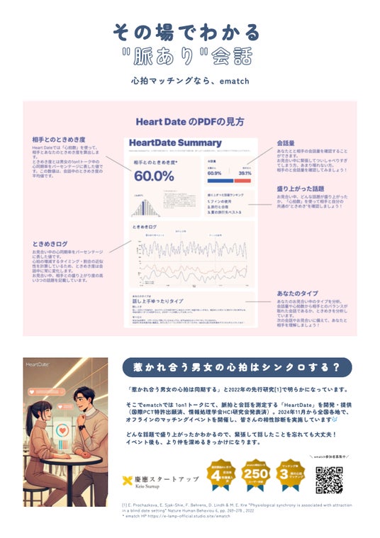 ematchは、株式会社e-lamp.が運営する、友活・恋活リアルイベント×心拍マッチング×コミュニケーション相談サービスです。本社拠点がある東京都渋谷を中心に、「同じ趣味」で繋がるコミュニティーイベントから、会話内容と心拍のシンクロ率から男女の相性が数値化できるデバイス”Heart Date”を活用したマッチング系イベントやセミナーの開催を行っております。イベント中は1人になっている席をつくらないイベント設計や、相手との会話内容や次に取るべきアクションがわかるツールを活用したイベントで高い満足度をいただいています。