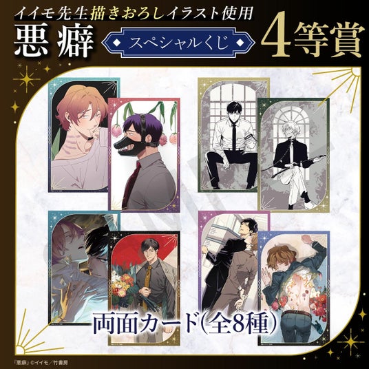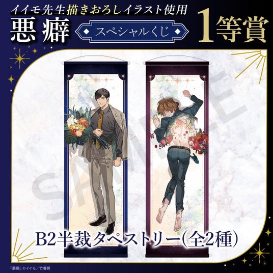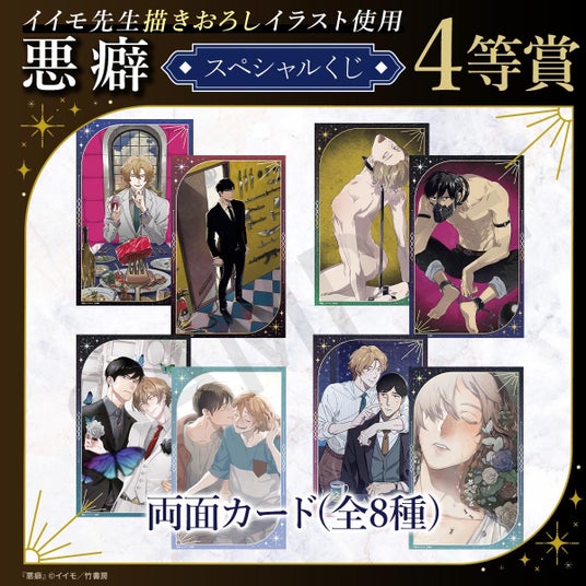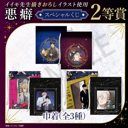 イイモ先生による大人気BL作品『悪癖』のスペシャルくじが登場!本くじのために描きおろされた美麗イラストをはじめ、コミックスの表紙イラストなどを使用した豪華なオリジナルグッズが多数ラインナップされています。