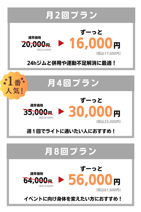 大手のパーソナルジムとは異なり、月額コースやお得な回数券のご用意がございます。