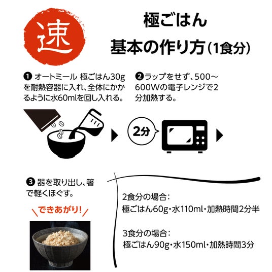 1.オートミール 極ごはんを耐熱容器に入れ、全体にかかるように水60mlを回し入れ、ラップをせずに電子レンジで500~600Wで2分加熱する。
