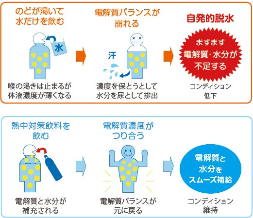 発汗時は水分補給だけでは十分とはいえません。水分と同時に電解質を摂ることで、体内の電解質バランスが正常に戻り、コンディションが維持されます。
