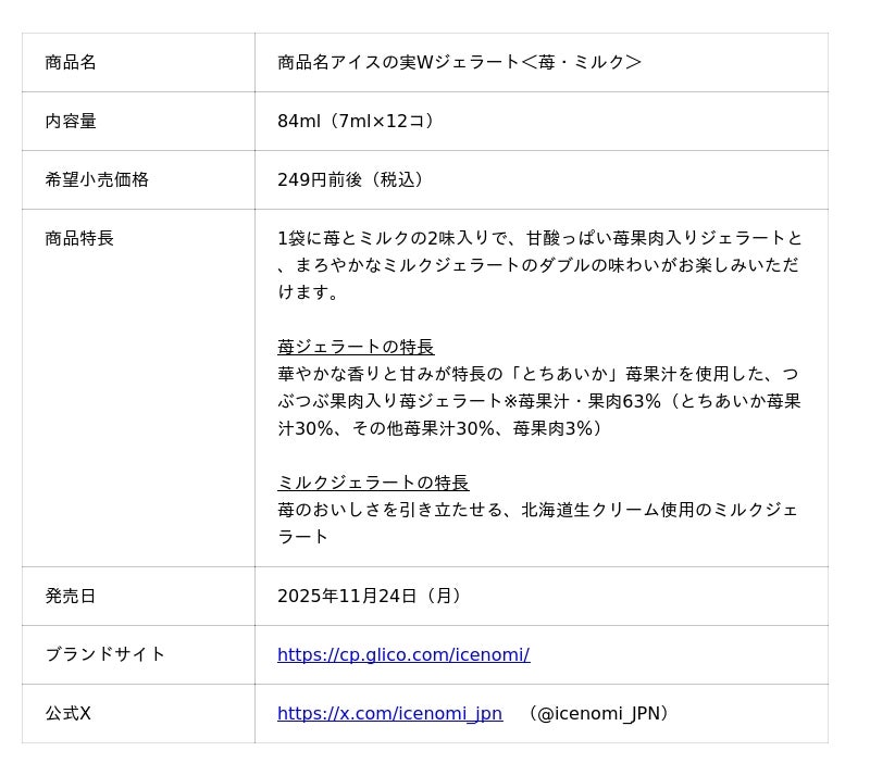 江崎グリコ株式会社は、ぎゅっと凝縮された素材の濃い味わいが特長のロングセラーブランド「アイスの実」から、1袋で苺とミルクの2つの味が楽しめる「アイスの実Wジェラート<苺・ミルク>」を、2025年11月24日(月)より全国にて期間限定発売します。