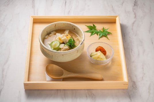瀬戸内の恵みをぎゅっと詰め込んだ、夏にぴったりの“広島風冷汁”。広島名物の穴子と、瀬戸内産の鯛を贅沢に加えた、上品な旨味が広がる一杯です。暑い季節にさらりといただける、爽やかな味わいをお楽しみください。
