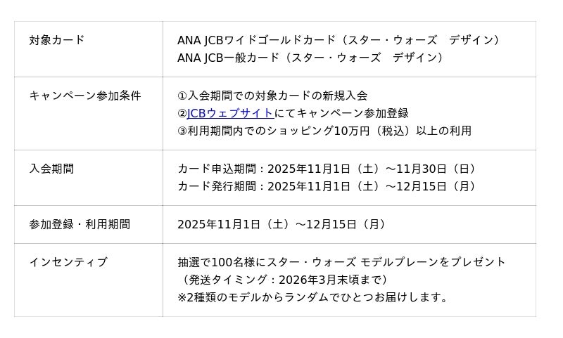 株式会社ジェーシービー (本社:東京都港区、代表取締役会長 兼 執行役員社長:二重 孝好、以下:JCB)は、全日本空輸株式会社(本社:東京都港区、代表取締役社長:井上 慎一、以下:ANA)と、2025年11月1日(土)から11月30日(日)まで、ANA JCBワイドゴールドカード(スター・ウォーズ デザイン)・ANA JCB一般カード(スター・ウォーズ デザイン)限定でスター・ウォーズ モデルプレーン プレゼントキャンペーン※1を実施します。