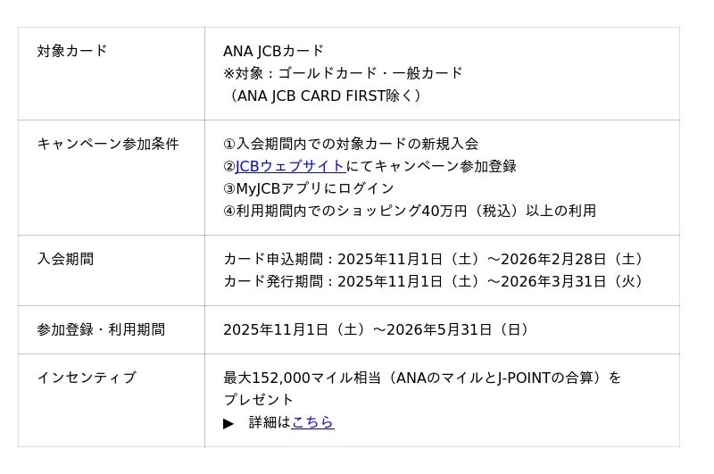 また、2025年11月1日(土)から2026年2月28日(土)まで、スター・ウォーズ デザインカードを含めたANA JCBカードで最大152,000マイル相当(ANAのマイルとJ-POINTの合算※2)がもらえる新規入会キャンペーンを実施します。