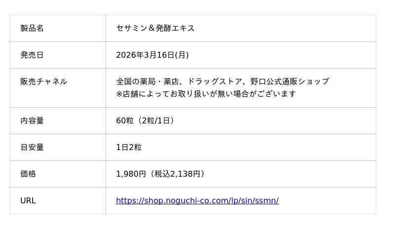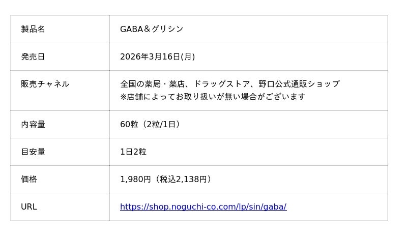 株式会社野口医学研究所は、働き盛り世代の毎日のコンディション維持をサポートするサプリメント、「GABA&グリシン」および「セサミン&発酵エキス」を、2026年3月16日(月)に発売します。