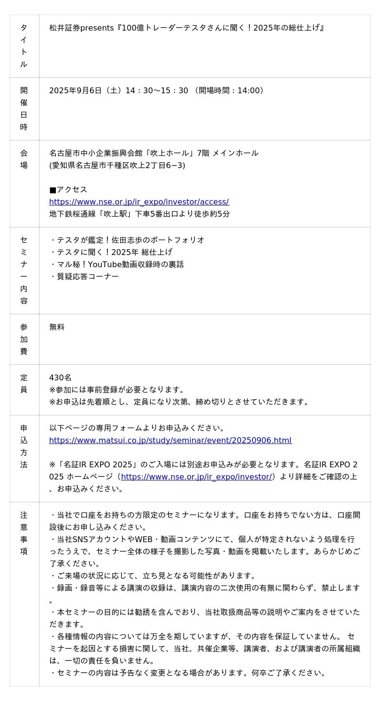 松井証券株式会社(本社:東京都千代田区、代表取締役 社長執行役員:和里田 聰、以下「当社」)は、名古屋証券取引所が主催する「名証IR EXPO 2025」において、2025年9月6日(土)に協賛セミナー「松井証券presents『100億トレーダーテスタさんに聞く!2025年の総仕上げ』」を開催することをお知らせします。