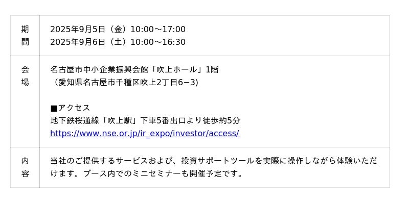 なお、「名証IR EXPO 2025」の開催期間中、当社が提供する各種ツールについてお試しいただけるブースを出展いたします。皆様のご来場を心よりお待ちしております。