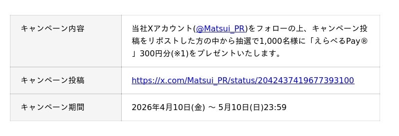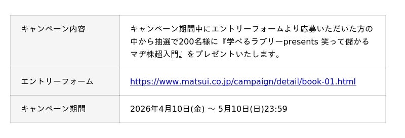 松井証券株式会社(本社:東京都千代田区、代表取締役 社長執行役員:和里田 聰、以下「当社」)は、2026年4月10日(金)に発売された書籍『学べるラブリーpresents 笑って儲かる マヂ株超入門』の発売を記念して、抽選で200名様に本書が当たるプレゼントキャンペーンを開始いたしました。また、300円分の「えらべるPay(R)」(※1)が抽選で1,000名様に当たるX フォロー&リポストキャンペーンも同時開催しております。