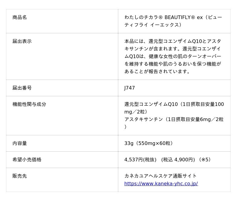 『わたしのチカラ(R) BEAUTIFLY(R) ex』は、還元型コエンザイムQ10(※4)を100mg配合したサプリメントです。「健康な女性の肌のうるおいに役立つ」機能だけでなく、新たに報告された「健康な女性の肌のターンオーバーを維持する」機能を追加し、機能性表示食品として発売します。還元型コエンザイムQ10に加え、抗酸化作用を持つアスタキサンチンを配合しており、肌の乾燥をカラダの内側からケアしたい大人の女性を日々サポートします。