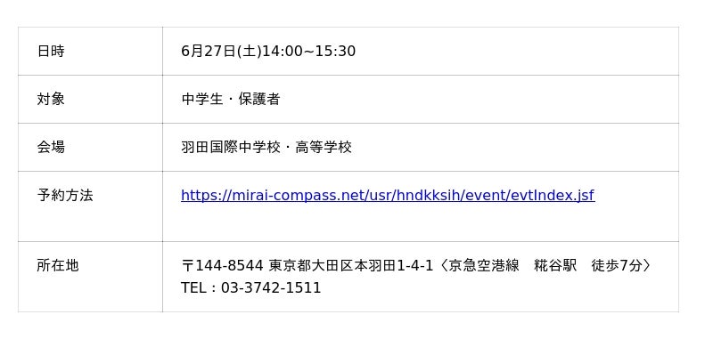 羽田国際高等学校(東京都大田区/校長:簡野裕一郎)は、令和9年度生徒募集の第一弾として、キックオフミーティング(プレ説明会)を6月27日(土)に開催いたします。キックオフミーティングでは、教育方針や教育プログラム、各コースの特徴、学校生活についてご説明するほか、ご質問コーナーも設けています。また、受験生・保護者の皆様が在校生(WINGSスタッフ)教職員と交流し、羽田国際の雰囲気を体感していただける機会にもなっています。