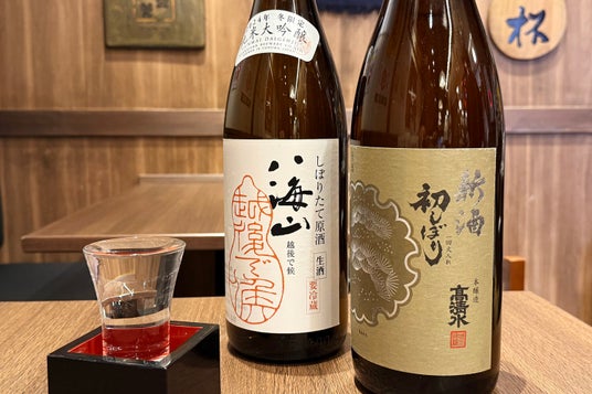 『庄や』といえば、全国蔵元より直送の銘酒の数々。冬の味覚にとびきり合う日本酒も用意します。1年間低温貯蔵した新潟県・八海醸造の「純米大吟醸八海山 しぼりたて原酒 越後で候(一合950円)」は、まろやかさと深みが特徴。旨味が凝縮したコク深い「ふぐ一夜干し焼き」や濃厚な「蒸しアワビ 肝バター醤油」と相性抜群です。また、秋田県・秋田酒類製造の「高清水 新酒 初しぼり(一合650円)」は、みずみずしくフレッシュな味わい。脂ののった「にしん炙り刺し」や「あんこう唐揚げ」などと、新酒ならではの軽やかな酸味がマッチします。