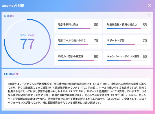 独自開発の「cocomo AI」が、各ネット証券を6つの観点で数値化。客観的な指標をもとに、ユーザーが直感的に比較できるようになりました。
